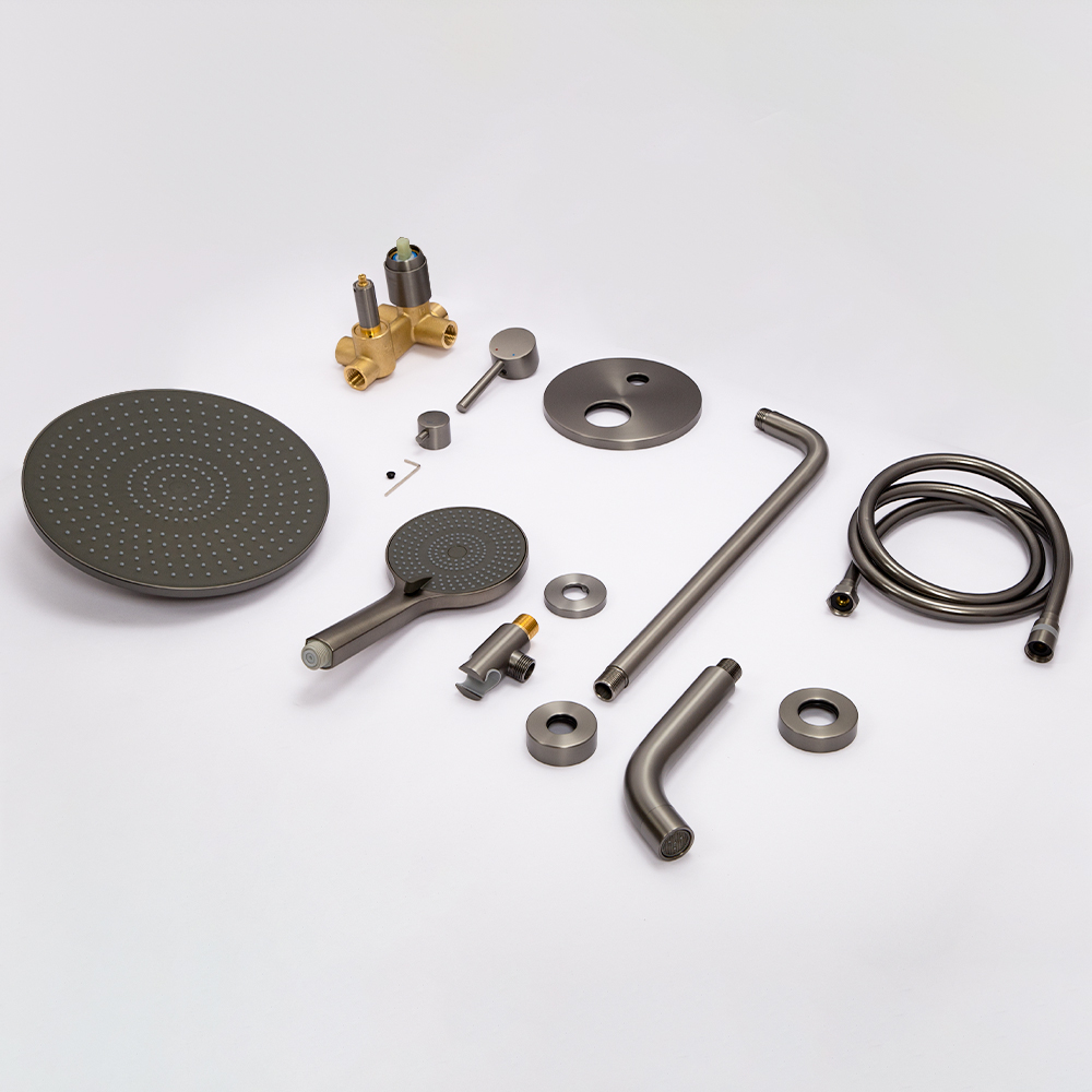 смеситель; монтажный блок; верхний душ; кронштейн верхнего душа; ручной душ; душевой шланг; настенный держатель; излив; инструкция.