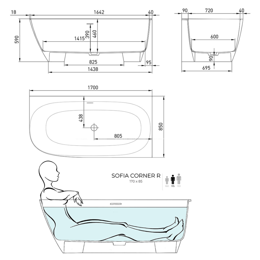 Ванна из искусственного камня Salini Sofia Corner S-Stone 170x85 R белая матовая, с донным клапаном