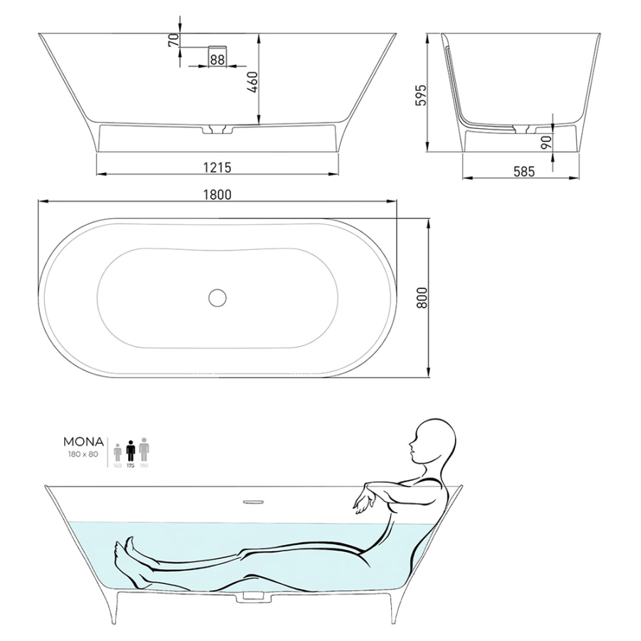 Ванна из искусственного камня Salini Mona S-Sense 180x80 белая с донным клапаном