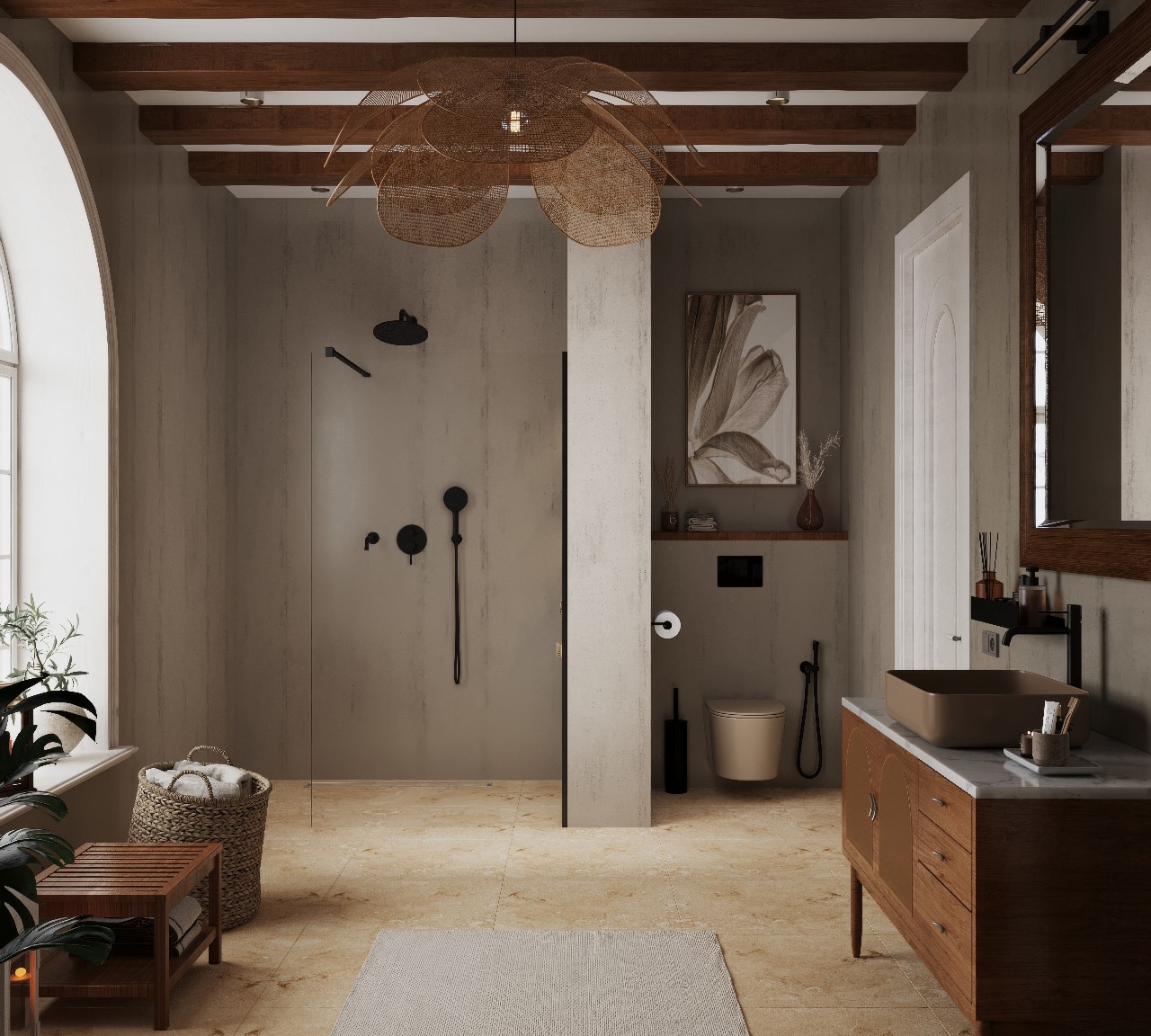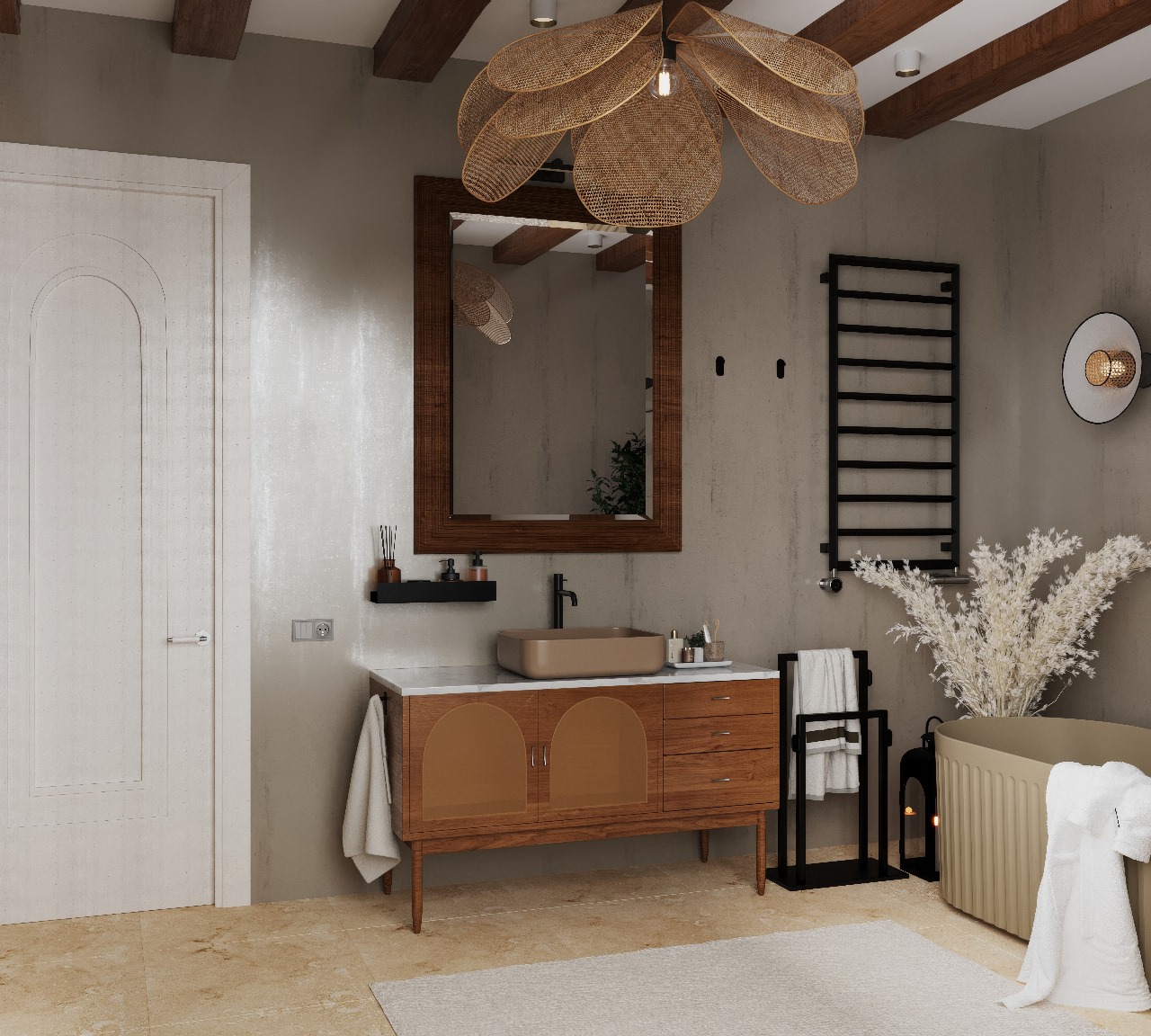 Представляю вам новую работу – ванную комнату, где царит гармония и умиротворение, вдохновленные самой природой, где каждый элемент пропитан теплом и естественностью!
